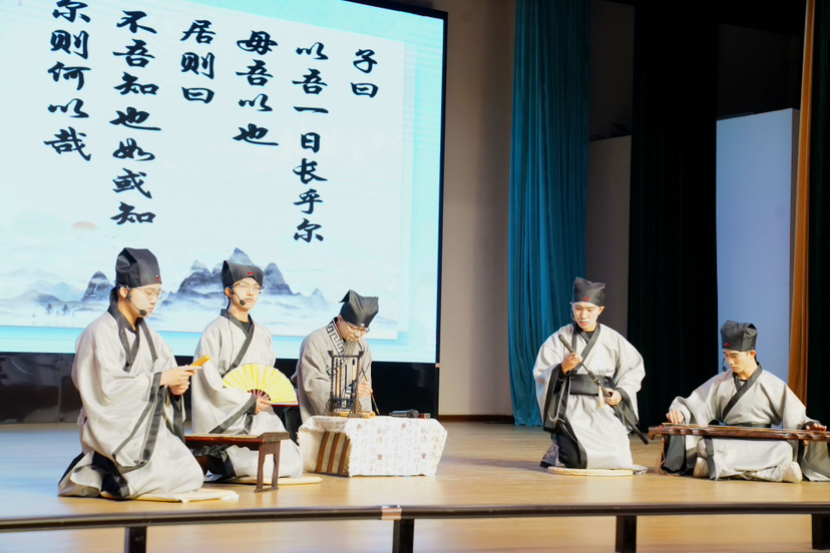 情景剧《青年在选择职业时的考虑》讲述了青年马克思的择业观,勉励同学们树立“为人类福利而献身”的志向;交流环节中,同学们利用AI以“我有什么样的梦想、想要结交什么样的朋友一起前行”为题进行诗词创作并分享……情景剧、朗诵、座谈交流、师生互动,“开学第一课”形式多样又贴近生活。