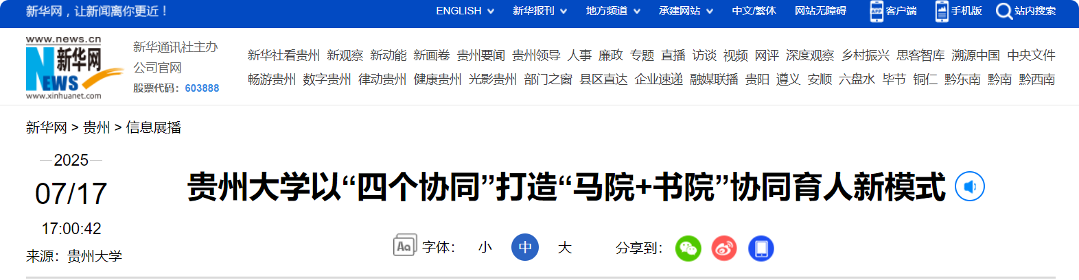 坚持机制协同,以制度创新夯实“马院+书院”融合基础。一是健全多层级架构机制。将“马院+书院”协同育人纳入校党委重点工作,构建“党委领导—专班推进—部门协同”的三级工作机制,成立由党委宣传部、教务处、马克思主义学院、中国文化书院、阳明学院负责人组成的工作专班,形成“党委书记统筹抓、分管校长具体抓、职能部门协同抓”的工作格局。二是探索调研转化应用机制。探索形成“精准调研—深度分析—高效转化—持续优化”机制,实现调研成果向育人实效的高效转化。今年以来,先后前往省外高校调研学习“一站式”学生社区建设、课程共建经验。调研后,在校内试行开展《中国传统文化概论》跨学科开发实践,将“四季读典”融入“书香贵大”活动,推动多项调研成果在贵州大学落地生根、开花结果。三是创新理论研究支撑机制。创新构建“省级重大课题抓方向、校级课题攻专题”的梯度研究机制,实现“以研促教、以教带研”的良性互动,推动协同育人工作从经验驱动向理论指导转变,助力育人工作朝着科学化、专业化方向持续迈进。充分发挥校领导示范引领作用,校党委主要负责同志亲自挂帅申报课题《贵州“马院+书院”两轮驱动促人才培养模式改革研究》,成功获批省委深改重大课题立项,配套设立校级专项课题,形成“马院+书院”理论研究与实践探索以上率下、相互促进的良好局面。