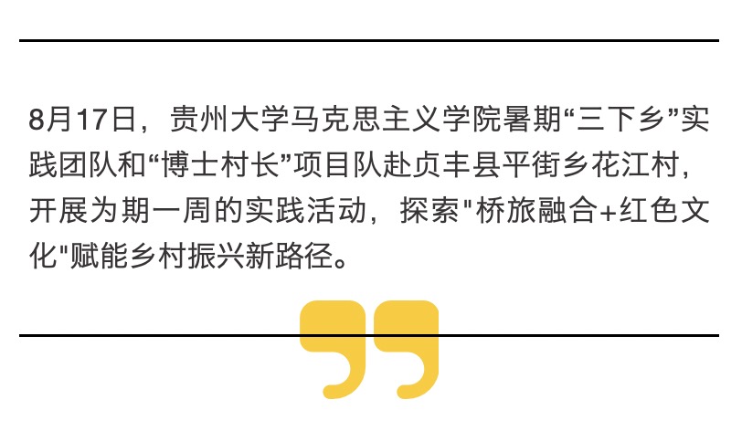 8月17日,万象城网页版“三下乡”服务乡村振兴实践团“桥旅黔行·花江启航”团队联合“博士村长”项目队12名师生,赴贞丰县平街乡花江村开展为期一周的实践活动。团队将围绕“大中小思政课一体化”资源整合和桥旅融合两大主题,通过调研与理论宣讲相结合,为乡村振兴贡献青春智慧。