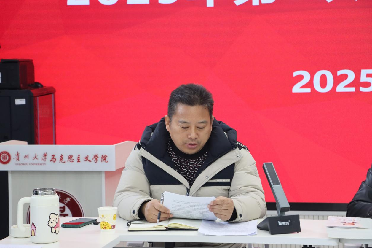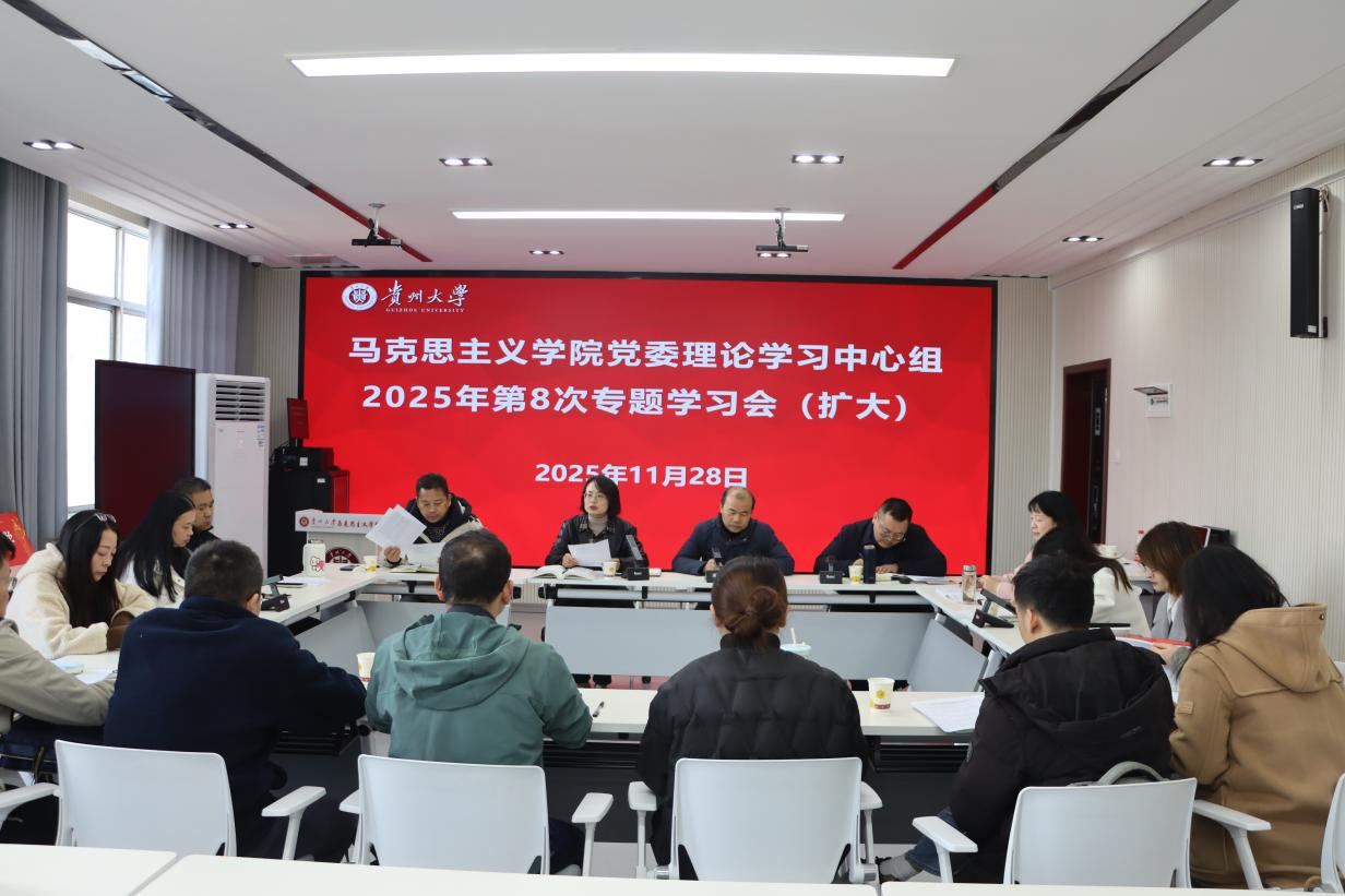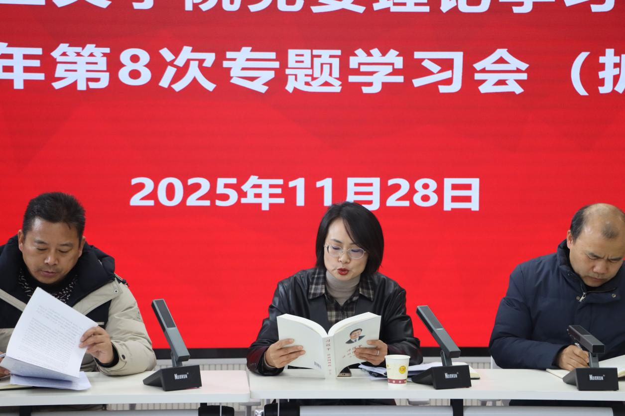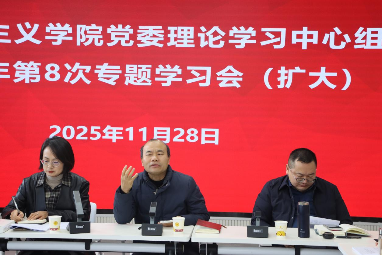 2025年11月28日上午,马克思主义学院党委2025年第八次理论学习中心组学习(扩大)会议在逸夫楼320智慧教室举行。院长李传兵,副院长崔东明,副书记、纪委书记吴凯,各教研室主任、党支部书记及全体管理岗人员参加。会议由学院党委书记蒋红霞主持。