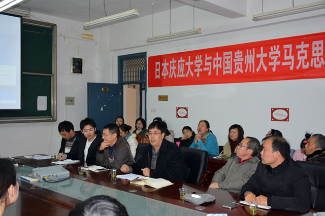 会议由我院卢正涛副院长主持。我院院长张国安、杨仁厚教授等对客人的到来表示了热烈欢迎,并作了热情洋溢的欢迎致词。张国安院长作了关于贵州大学及马克思主义学院的历史、学科建设和人才培养相关状况的介绍,并表示希望今后能加强贵州大学与日本庆应大学之间的学术教育交流与合作。杨仁厚教授指出日本在早期马克思主义著作翻译方面成就斐然,为马克思主义的传播做出了很大贡献,自己有很多相关书籍的收藏,希望通过此次交流双方能作出更多探讨,加深联系共同进步。