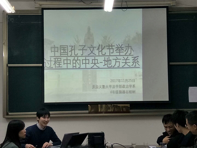 随后,日本庆应大学的学生分三组,分别由董方達、趙峻峭、陳冠宇“安倍晋三的安全保障观”, 實村亮、荒屋凪、武藤遼“梅屋庄吉与孙中山”,御器谷裕樹“中国孔子文化节举办过程中的中央—地方关系”作了研究报告。