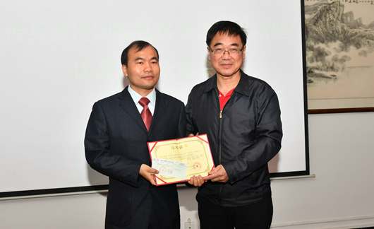 蔡中孚宣读表彰决定,向李传兵教授获国家社科基金项目结题优秀等次致以热烈祝贺,并向李传兵颁发表彰证书、结项证书。