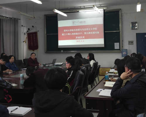 贵州大学机关党委与马克思主义学院第三十期入党积极分子、第九期发展对象开班仪式于2019年4月6日上午9点在逸夫楼616会议室进行。机关党委杨婷书记、马克思主义学院党委书记杨仁厚老师,以及各入党积极分子和发展对象出席本次开班仪式,会议由马克思主义学院党委书记杨仁厚老师主持。