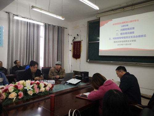 其次,在理论学习部分,杨仁厚书记依次向大家传达了学校警示教育大会精神;学校宗教工作会议精神;十九届四中全会精神。第一,杨仁厚书记向大家传达学校警示教育大会精神,这是主题教育当中的一个重要环节。警示教育内容丰富,杨仁厚书记首先向大家传达贵州省纪委驻贵州大学特派专员宣布的校内外的一些违法违纪的案例。其次是贵州大学党委副书记令狐彩陶同志通报的第二批校内巡查所发现的问题。最后,杨仁厚书记还对老师提出建议,希望所有教师提高警惕,做好榜样。第二,杨仁厚书记向大家传达学校宗教工作会议精神,中央对宗教工作高度重视,杨书记表示我们要坚决贯彻国家的宗教原则和方针,加强执行国家宗教政策,贯彻二十字方针“保护合法、制止非法、抵御渗透、遏制极端、打击犯罪”,要求干部党员、政治理论教师认真学习国务院宗教工作条例以及习近平总书记对宗教工作的论述,积极引导宗教与社会主义事业相适应。第三,学习十九届四中全会精神。这是《中共贵州大学委员会关于认真学习宣传贯彻党的十九届四中全会精神的通知》要求的。杨书记表示,十九届四中全会包括习近平做的工作报告、通过的文件以及习近平对通过文件的说明,所涉及的内容全面丰富。杨书记挑选报告当中的一点——坚持马克思主义在意识形态领域指导地位的根本制度,带领大家学习,主要有全面贯彻落实习近平新时代中国特色社会主义思想、深入实施马克思主义理论研究和建设工程、加强和改进学校思想政治教育、落实意识形态工作责任制。这些内容是十九届四中全会精神所通过的诸多内容之一,老师同学应该结合自己的研究专长、所承担的课程,认真学习、研究、宣传。