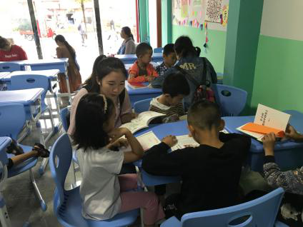手势舞结束以后,同行研究生同学就到场中小学学生各自挑选书籍进行阅读指导活动。数位中小学学生围绕着一位研究生同学进行热烈交流,研究生同学们结合自身经验就阅读方法、学习技巧、未来展望等多方面对在场小朋友进行交流指导。现场气氛活跃,孩子们的脸上洋溢着笑容,眼中充满了光芒。“四点半学校”为西城社区为区内适龄中小学学生课后免费教学、作业辅导学校,虽只有两间小小的教室,却装载着社区大大小小数百人的梦想,更是城乡之间、地区之间缩小教育差距征程上的有力之举。