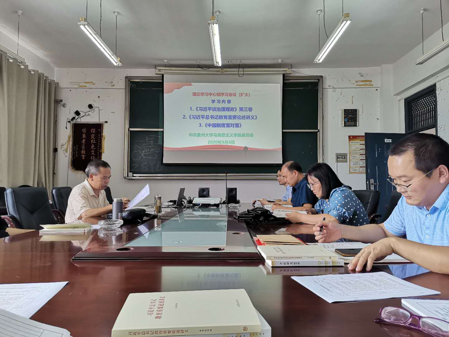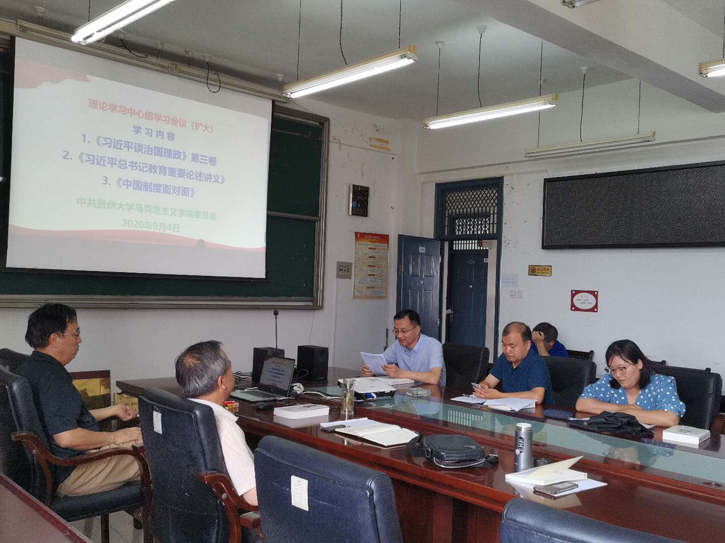 2020年9月4日下午,万象城网页版举行学院党委理论学习中心组学习会议(扩大),会议学习《习近平谈治国理政》第三卷、《习近平总书记教育重要论述讲义》和《中国制度面对面》。马克思主义学院党委书记杨仁厚、院长张国安、副院长李传兵、副院长郭红军、副院长卢正涛、马克思主义学院各支部委员及研究生党支部委员参加会议。会议由学院党委书记杨仁厚主持。