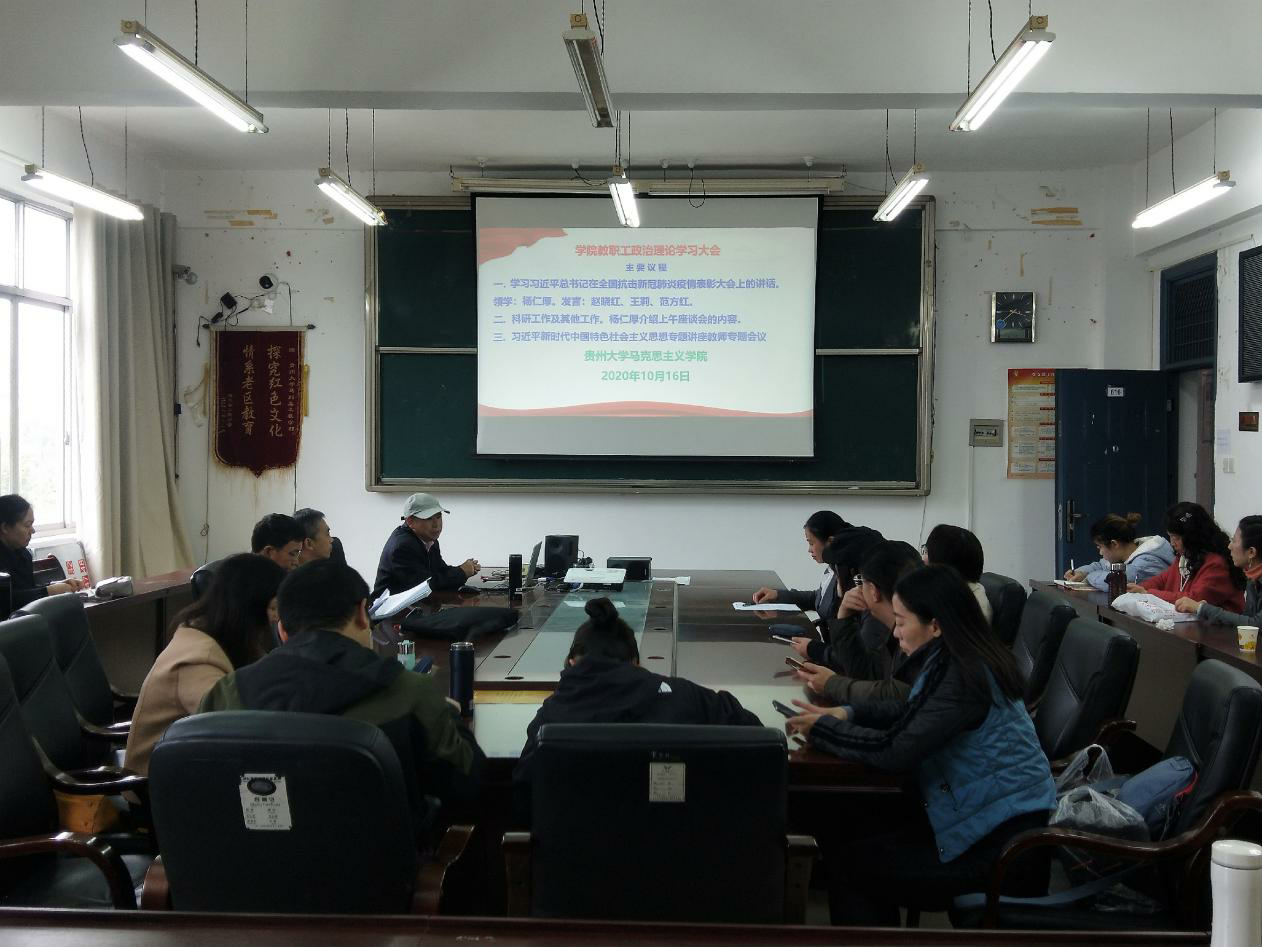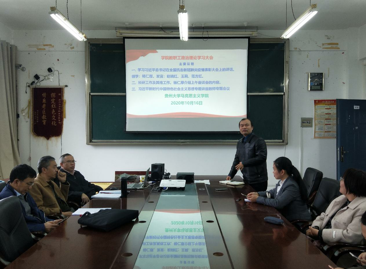 2020年10月16日下午,万象城网页版在六楼会议室举行本学期第三次教职工政治理论学习大会。学院领导、全体教职工参加会议。会议由马克思主义学院党委书记杨仁厚主持。